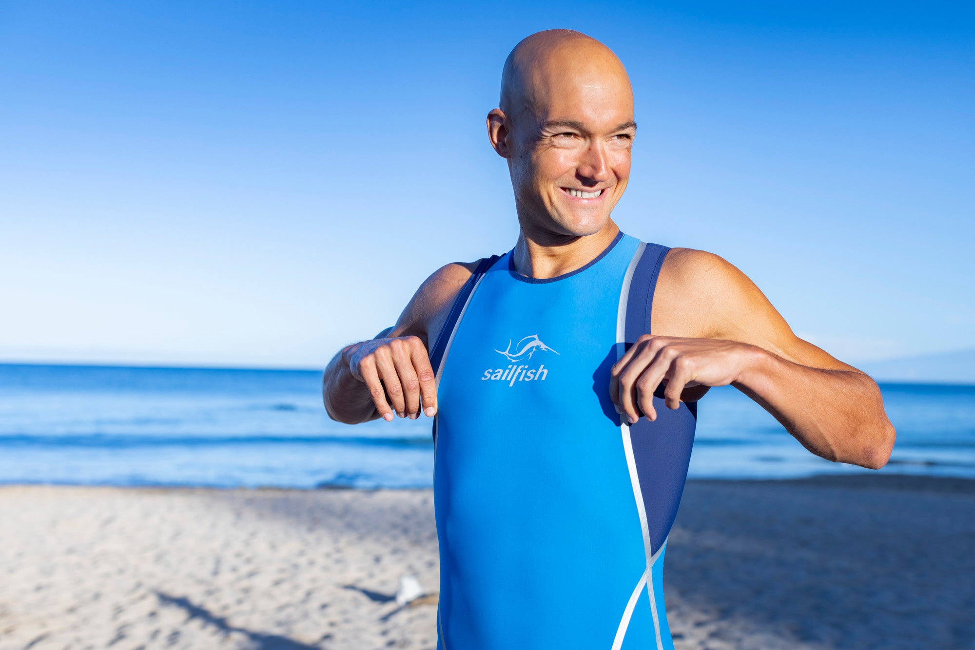 Voděodpudivá tělo tvarující kombinéza použitelná při zákazu neoprenu pro všechna triatlonová odvětví.