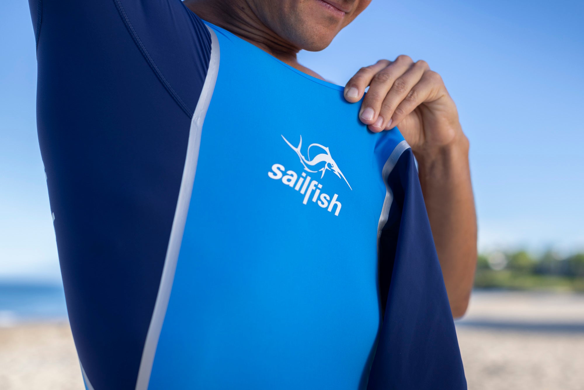 Speciální zrychlující kombinéza s krátkým rukávem pro střední a dlouhý triatlon za situace, že je kvůli teplotě vody zakázán neopren.